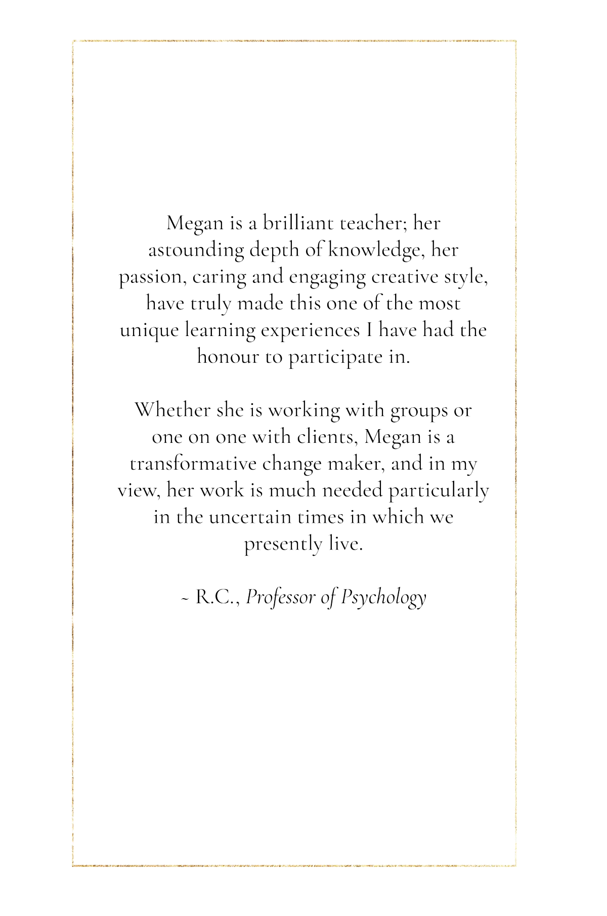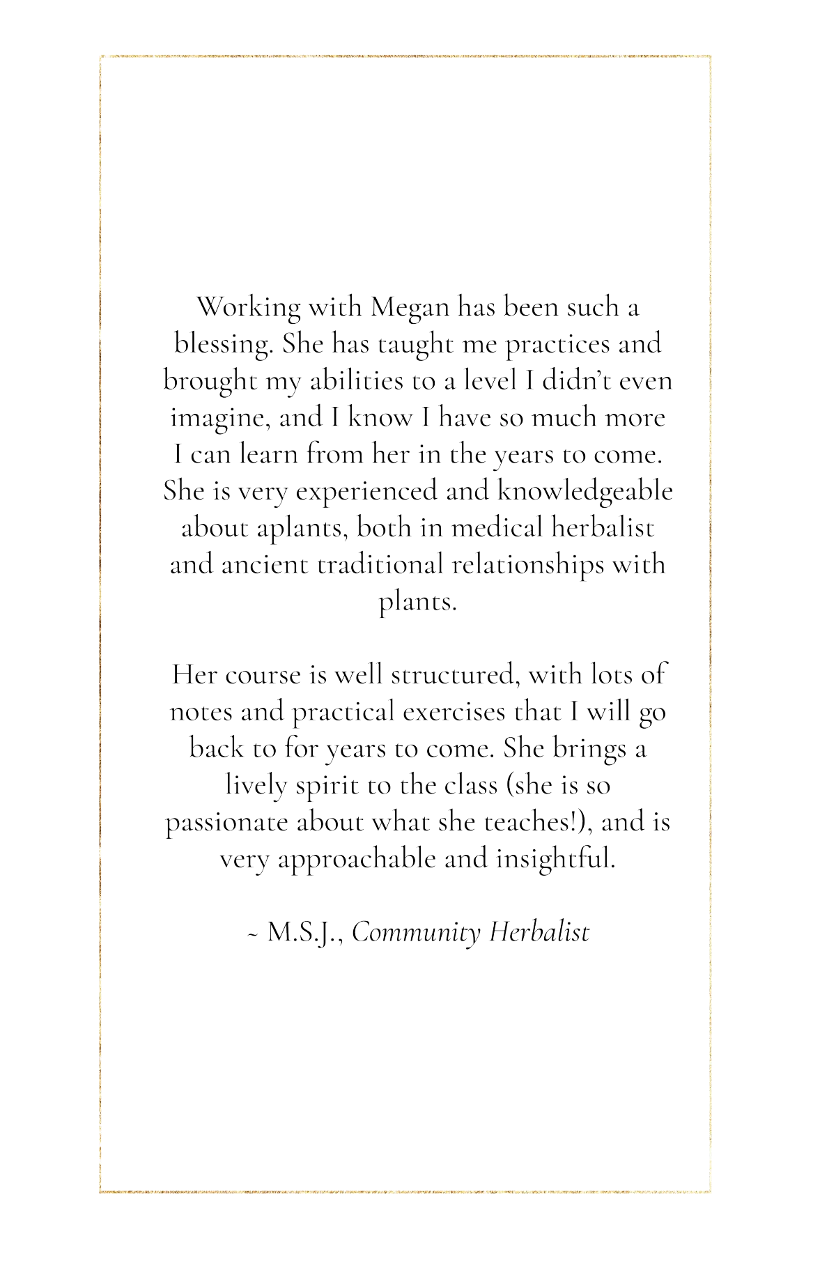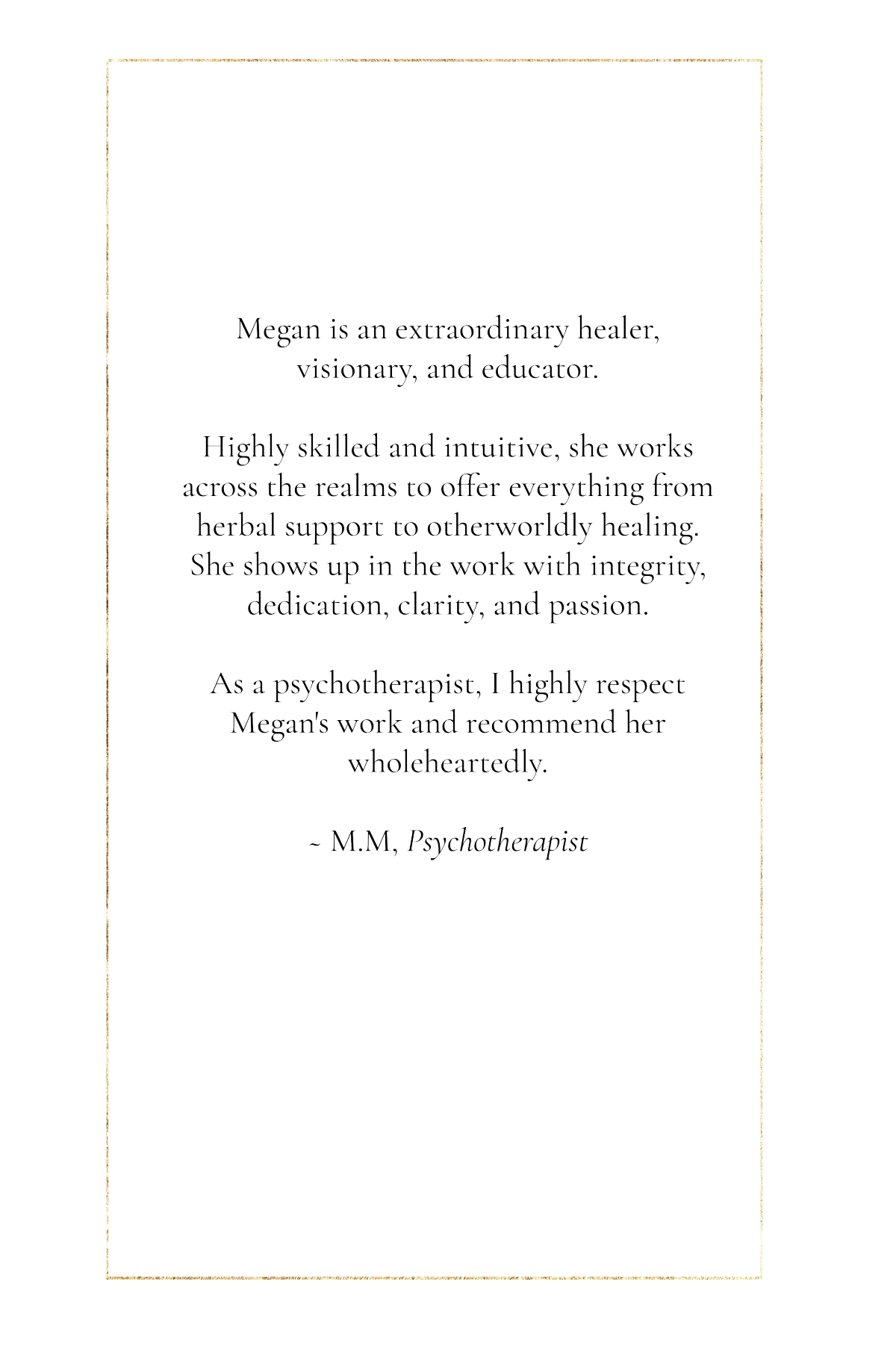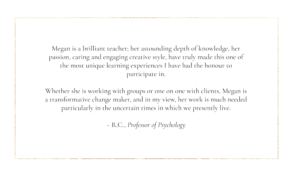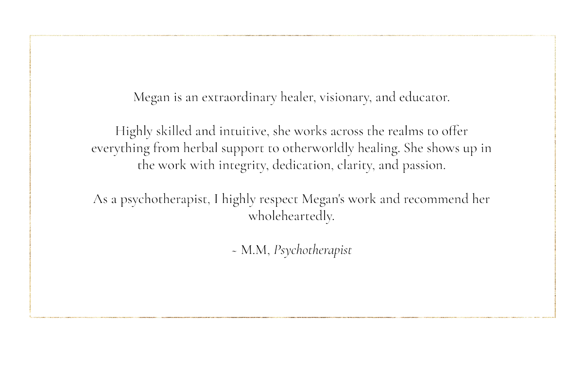 Alongside her formal education, Megan has devoted over twenty years to advanced apprenticeship in plant-spirit medicine, ancestral and land-based healing traditions, and ceremonial practice. Plants have been her primary teachers since early life, shaping an understanding of healing as an ongoing conversation between the human and more-than-human worlds.