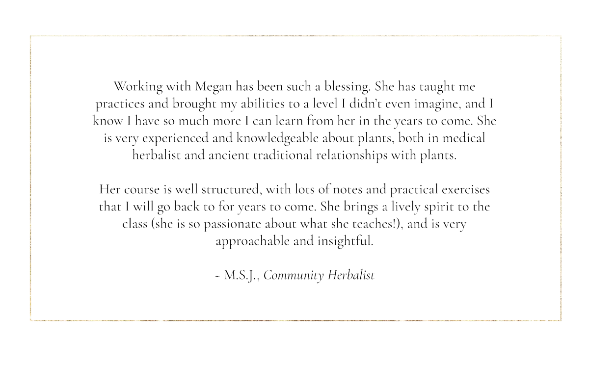 Through her teaching, apprenticeship programs, and ceremonial work, Megan has guided thousands of students and clients in reconnecting with plant intelligence, embodied knowing, and the deeper rhythms of nature. Her work invites reverence, humility, and direct experience, allowing the plants themselves to lead the way.